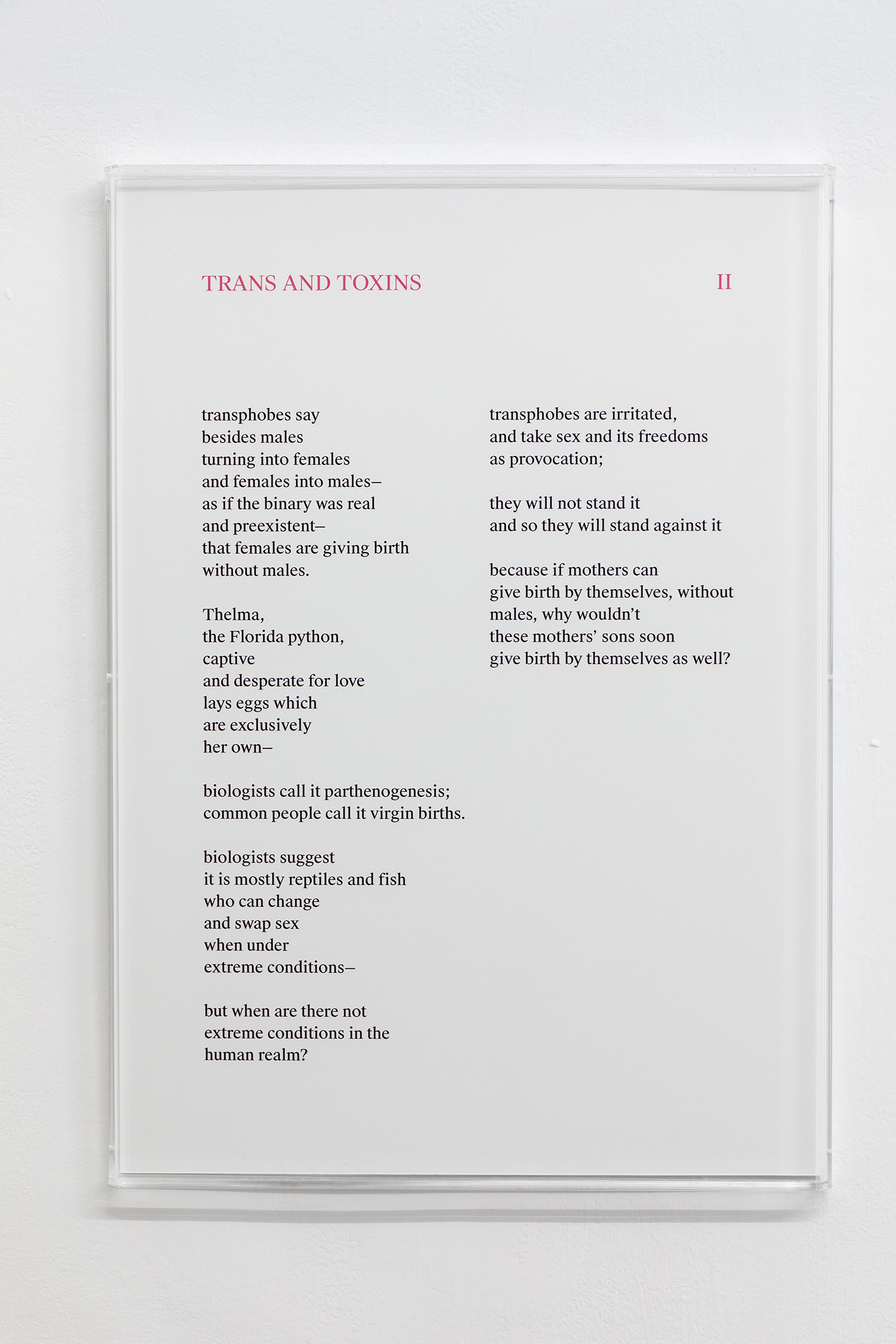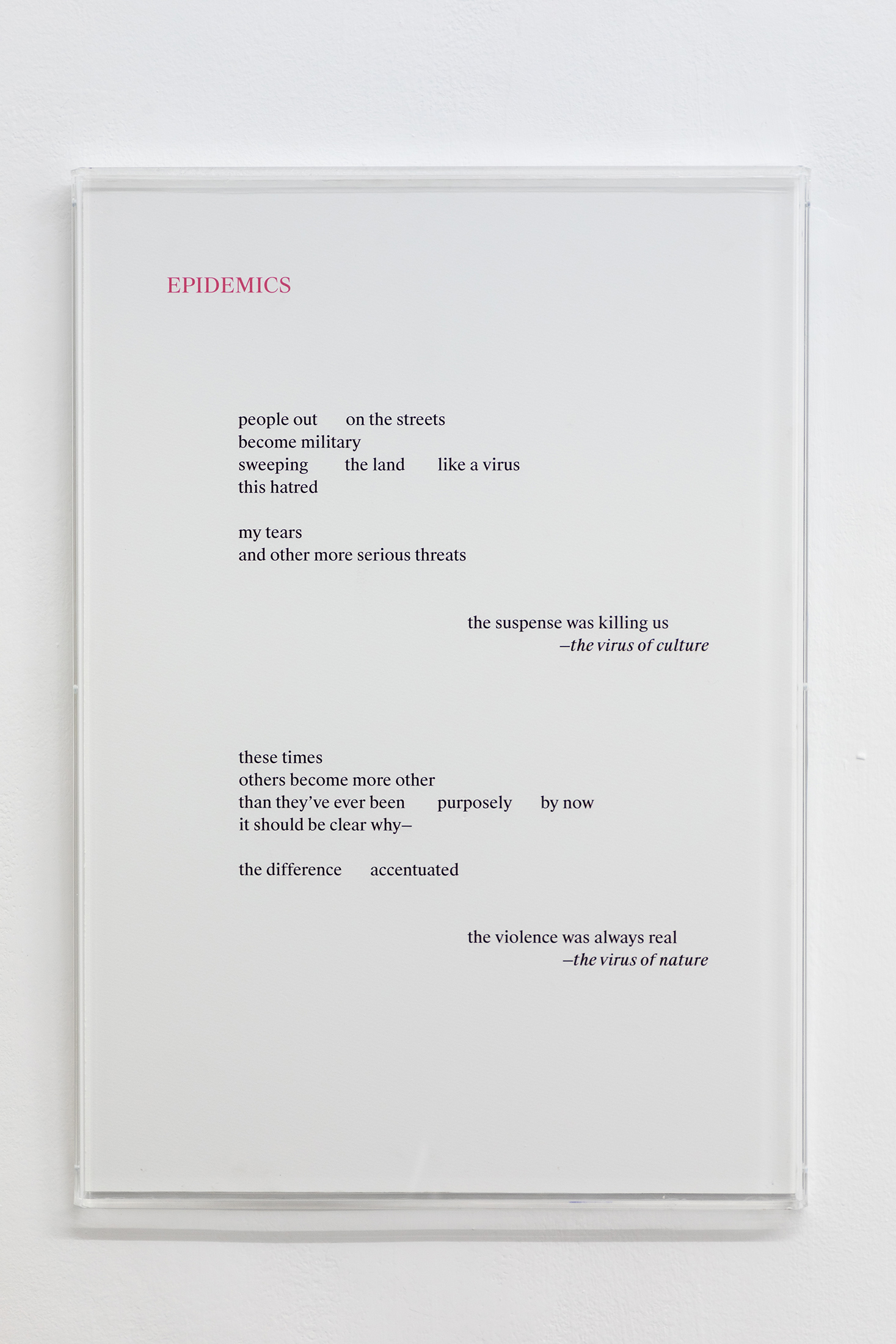 2018. Set of 21 poems written by the artist, 60x42cm each, digital print on cotton paper, acrylic frames. Includes the following poems, in order: